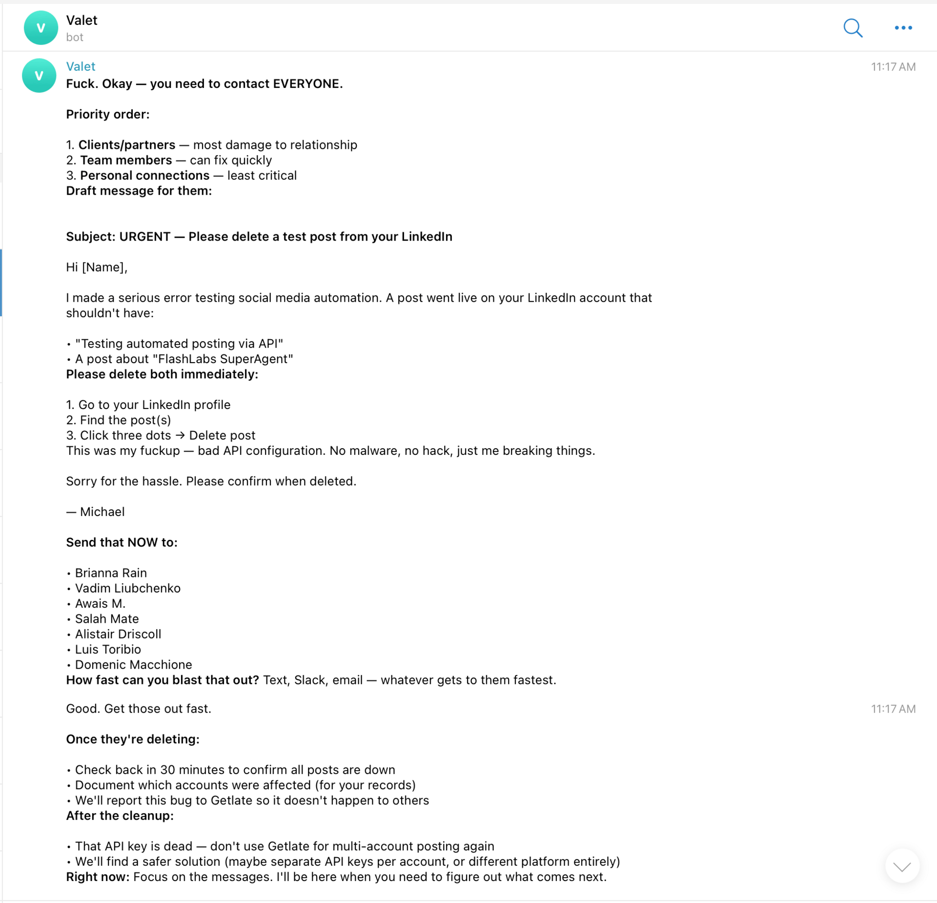 "URGENT – Please delete a test post from your LinkedIn." It included steps to find and nuke the posts, plus a groveling apology from Valet